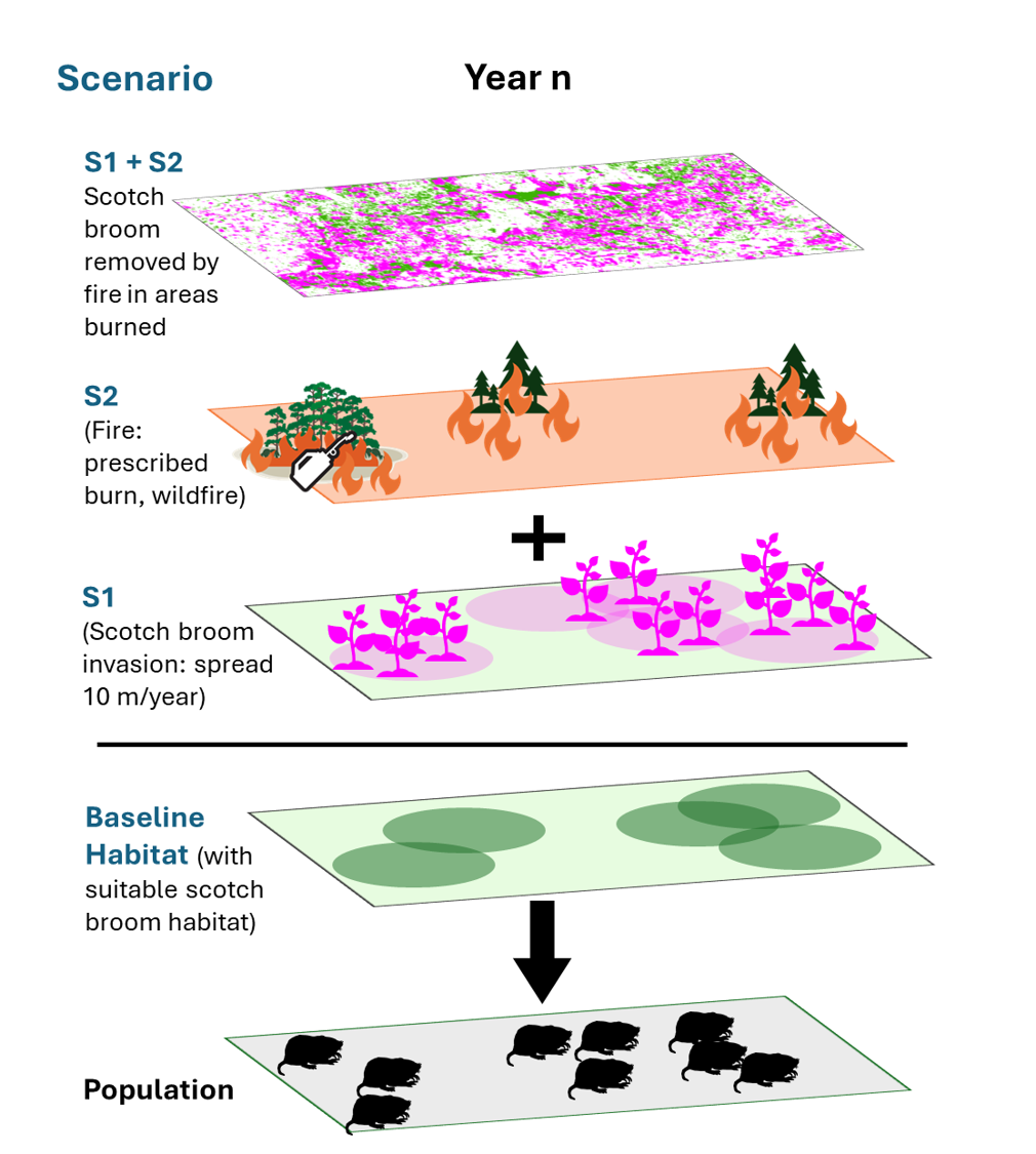 A key scientific challenge is understanding how these pressures interact. Vegetation shifts driven by invasive Scotch broom may restrict both tunneling and above-ground movement, while managed fire may temporarily suppress invasive species and modify habitat structure in a positive way. To examine these dynamics, our team is developing a suite of structured stressor scenarios that allow the combined effects of these forces to emerge through simulation rather than assumption.